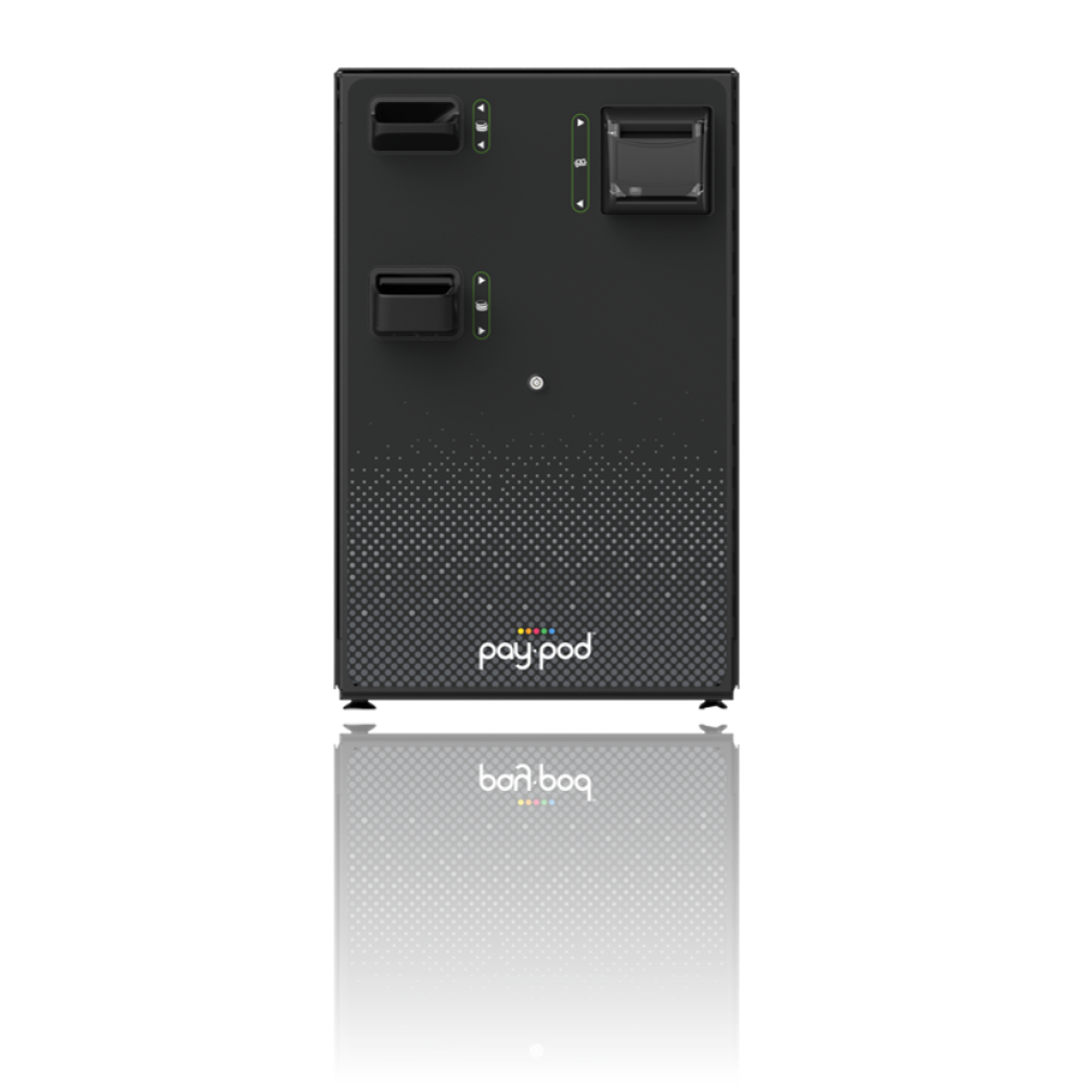 Paypod Embedded easily fits under standard retail counters. The robust, hardened design is secure with a lockable enclosure door, lockable banknote recycler cashbox, and a dual-locking feature on the coin recycler. The rolling cart with swivel base provides 360° access to the cash devices from behind the counter.